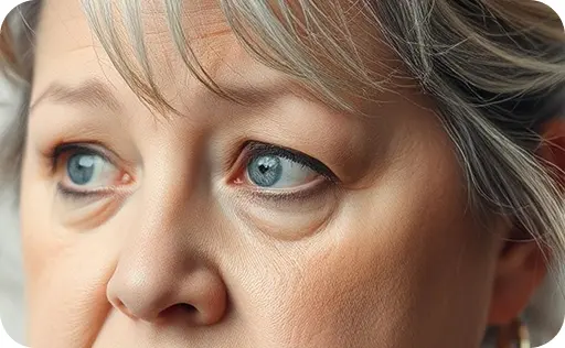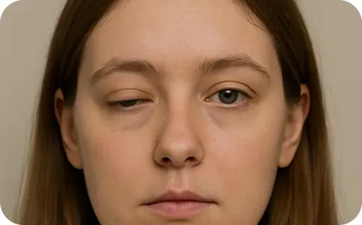Pálpebras caídas que alteram sua expressão natural, transmitindo tristeza mesmo quando você está feliz.